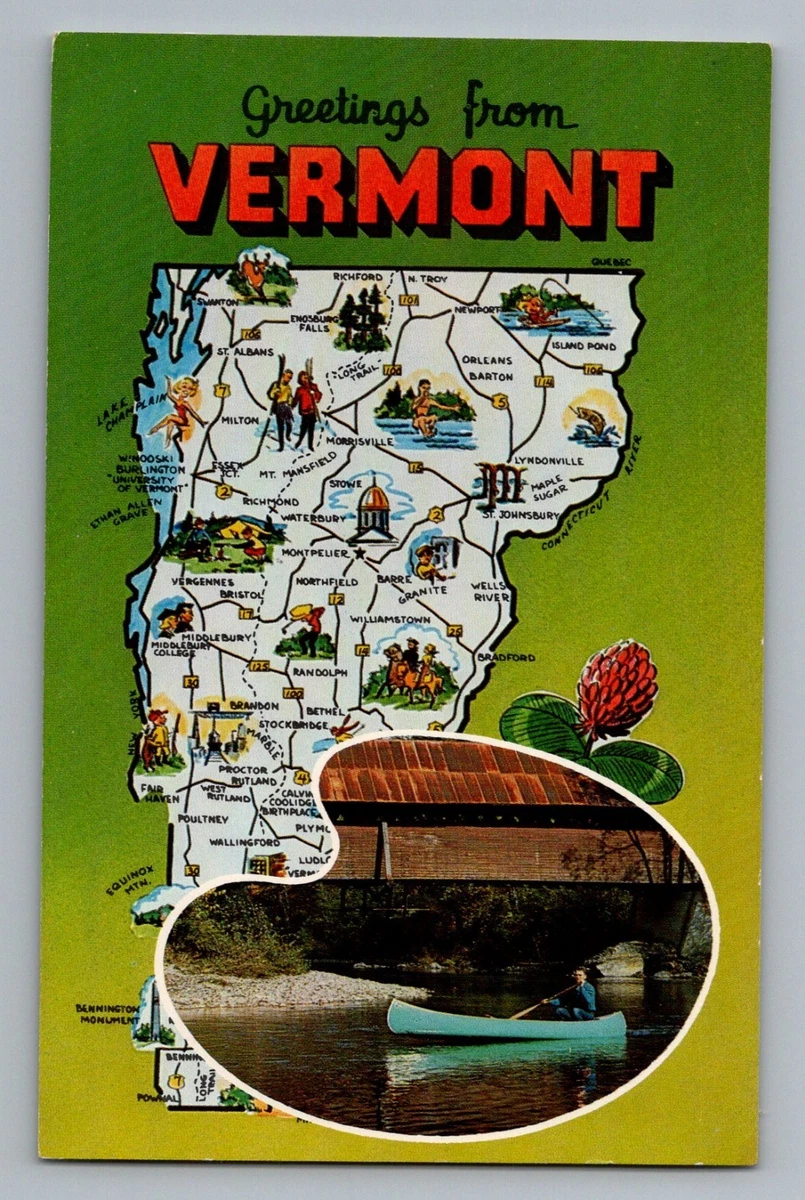 Greetings From Vermont VT State Town Highway Map Boat Postcard